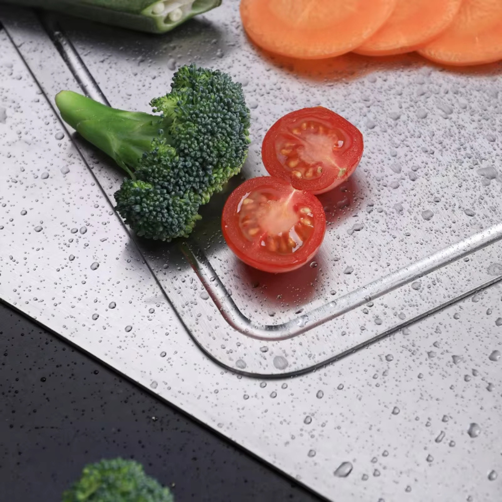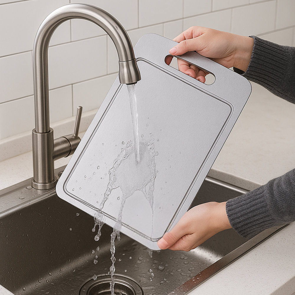 Keine Keime, kein Schimmel, keine Plastikfasern für sicheres und gesundes Kochen. Das Schneidebrett besteht komplett aus Titan und bleibt dadurch dauerhaft sauber und hygienisch.